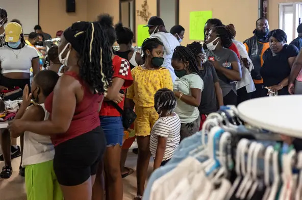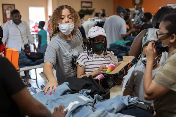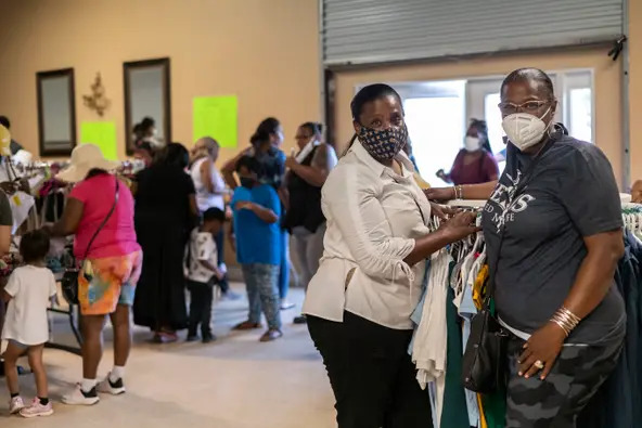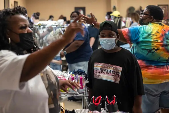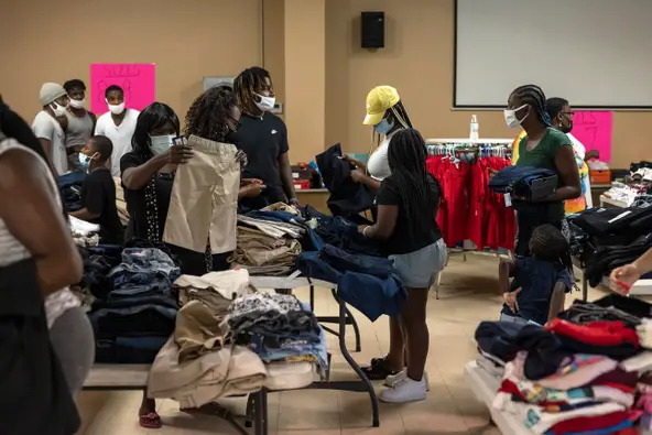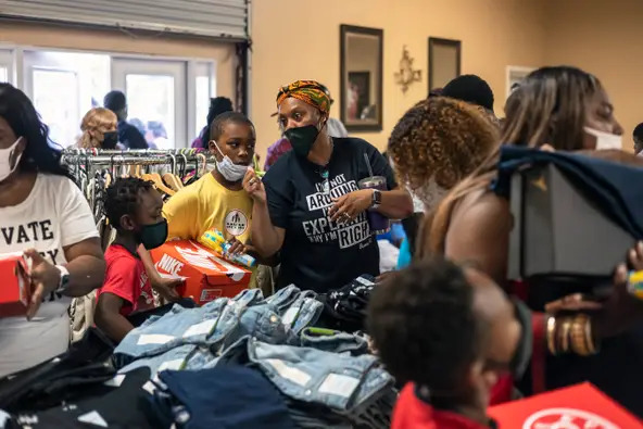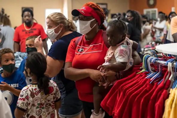 Children and parents pick out their clothing during the 8th annual Back to School Giveaway event hosted by Sheila Hill and Sharon Barnet, affectionately called the “Twin Angels” by the Athens community, and Leta Davis on Sunday, July 24, 2022 in Athens. The giveaway included free school supplies, uniforms, shoes and hygiene products, all donated from nearby counties and states, and as far as California. This year’s event was the largest yet. “It’s overwhelming,” Sheila Hill said. “The kids are so happy, smiling at having good shoes,” continued her twin sister Sharon Barnet, “It feels good.” KAYLA RENIE, ATHENS BANNER-HERALD USA TODAY NETWORK