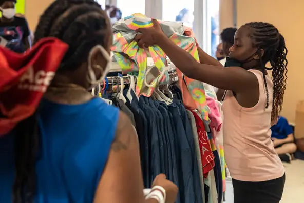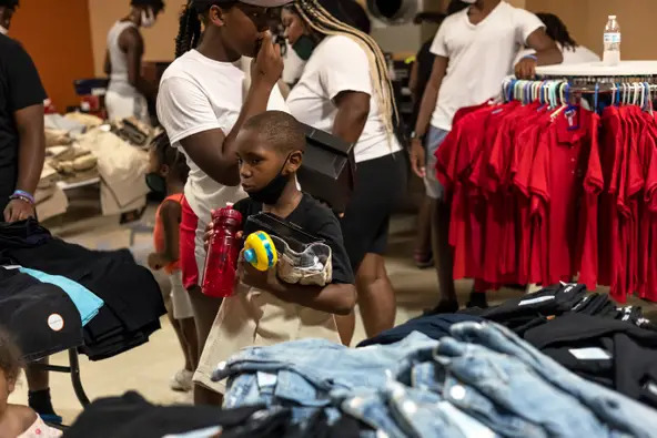 Children pick out their clothes during the 8th annual Back to School Giveaway event hosted by Sheila Hill and Sharon Barnet, affectionately called the “Twin Angels” by the Athens community, and Leta Davis on Sunday, July 24, 2022 in Athens. The giveaway included free school supplies, uniforms, shoes and hygiene products, all donated from nearby counties and states, and as far as California. This year’s event was the largest yet. “It’s overwhelming,” Sheila Hill said. “The kids are so happy, smiling at having good shoes,” continued her twin sister Sharon Barnet, “It feels good.” KAYLA RENIE, ATHENS BANNER-HERALD USA TODAY NETWORK