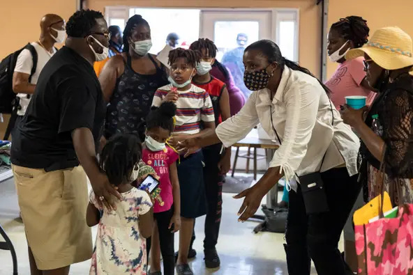 Sheila Hill helps direct families to wait in line for their turn to shop during the 8th annual Back to School Giveaway event hosted by Sheila Hill and Sharon Barnet, affectionately called the “Twin Angels” by the Athens community, and Leta Davis on Sunday, July 24, 2022 in Athens. The giveaway included free school supplies, uniforms, shoes and hygiene products, all donated from nearby counties and states, and as far as California. This year’s event was the largest yet. “It’s overwhelming,” Sheila Hill said. “The kids are so happy, smiling at having good shoes,” continued her twin sister Sharon Barnet, “It feels good.” KAYLA RENIE, ATHENS BANNER-HERALD USA TODAY NETWORK