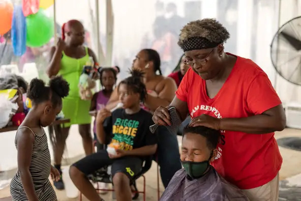 Diane Thomas of Upscale Cuts combs the hair of Lagavin Gresham, 8, during the 8th annual Back to School Giveaway event hosted by Sheila Hill and Sharon Barnet, affectionately called the “Twin Angels” by the Athens community, and Leta Davis on Sunday, July 24, 2022 in Athens. The giveaway included free school supplies, uniforms, shoes and hygiene products, all donated from nearby counties and states, and as far as California. KAYLA RENIE, ATHENS BANNER-HERALD USA TODAY NETWORK