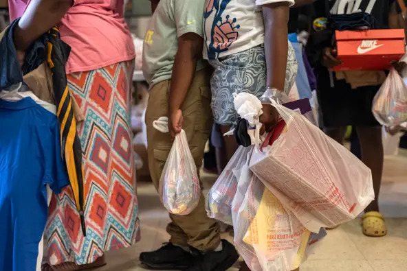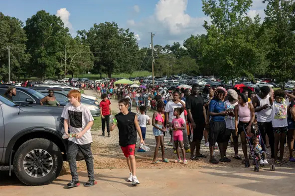 Children and parents wait in line with bags of supplies during the 8th annual Back to School Giveaway event hosted by Sheila Hill and Sharon Barnet, affectionately called the “Twin Angels” by the Athens community, and Leta Davis on Sunday, July 24, 2022 in Athens. The giveaway included free school supplies, uniforms, shoes and hygiene products, all donated from nearby counties and states, and as far as California. This year’s event was the largest yet. “It’s overwhelming,” Sheila Hill said. “The kids are so happy, smiling at having good shoes,” continued her twin sister Sharon Barnet, “It feels good.”. KAYLA RENIE, ATHENS BANNER-HERALD USA TODAY NETWORK