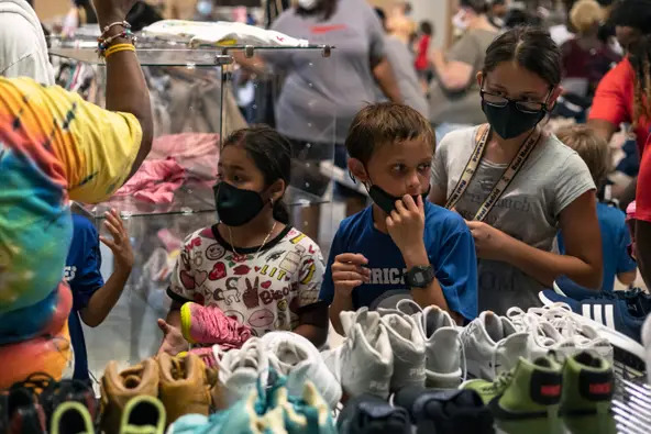 Children and parents wait for their turn to shop during the 8th annual Back to School Giveaway event hosted by Sheila Hill and Sharon Barnet, affectionately called the “Twin Angels” by the Athens community, and Leta Davis on Sunday, July 24, 2022 in Athens. The giveaway included free school supplies, uniforms, shoes and hygiene products, all donated from nearby counties and states, and as far as California. This year’s event was the largest yet. “It’s overwhelming,” Sheila Hill said. “The kids are so happy, smiling at having good shoes,” continued her twin sister Sharon Barnet, “It feels good.” KAYLA RENIE, ATHENS BANNER-HERALD USA TODAY NETWORK