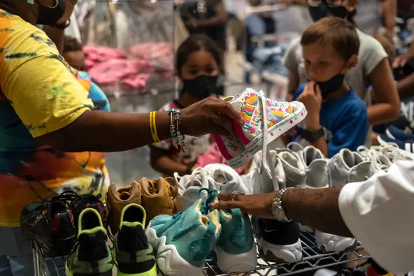 Children pick out their shoes during the 8th annual Back to School Giveaway event hosted by Sheila Hill and Sharon Barnet, affectionately called the “Twin Angels” by the Athens community, and Leta Davis on Sunday, July 24, 2022 in Athens. Nike, Vans and Jordan shoes were donated from nearby counties and states, and as far as California. This year’s event was the largest yet. “It’s overwhelming,” Sheila Hill said. “The kids are so happy, smiling at having good shoes,” continued her twin sister Sharon Barnet, “It feels good.” KAYLA RENIE, ATHENS BANNER-HERALD USA TODAY NETWORK