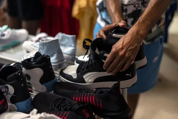 A volunteer organizes shoes during the 8th annual Back to School Giveaway event hosted by Sheila Hill and Sharon Barnet, affectionately called the “Twin Angels” by the Athens community, and Leta Davis on Sunday, July 24, 2022 in Athens. Nike, Vans and Jordan shoes were donated from nearby counties and states, and as far as California. This year’s event was the largest yet. “It’s overwhelming,” Sheila Hill said. “The kids are so happy, smiling at having good shoes,” continued her twin sister Sharon Barnet, “It feels good.” KAYLA RENIE, ATHENS BANNER-HERALD USA TODAY NETWORK